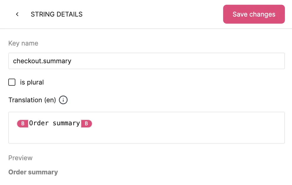 On the page, when you open String details, you can define a variable by using the ICU syntax you know from Tolgee ({varName}). This way, you can later find it on the Tolgee platform, and the developers will know how to approach it.