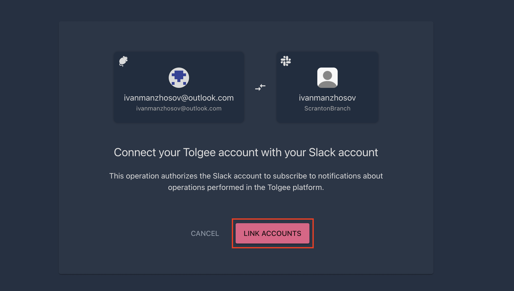 Now you need to link your Tolgee account with your Slack account. We need this to identify you and provide you with the necessary permissions. Here is how you can do that: